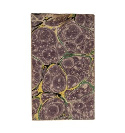 Couverture de papier marbré à dominante de parme, vert et jaune.