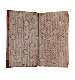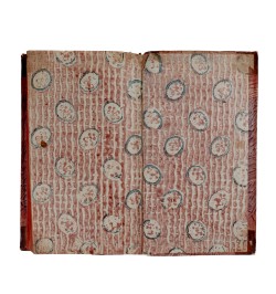 Les plats sont recouverts d'un beau papier à la colle, les gardes sont réalisées avec un élégant papier dominoté à dominance de rose et de bleu.