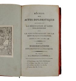 James Harris (1746-1820), diplomate anglais, fut nommé comte de Malmesbury en 1788. Le ministère britannique à Westminster, envoya Malmesbury comme ministre plénipotentiaire à Paris en octobre 1796 pour entamer des négociations de paix avec le Directoire qui furent bientôt rompues. Ces vaines négociations font suite à la signature du Traité de Bâle qui marque la paix entre la France et le royaume de Prusse le 5 avril 1795.