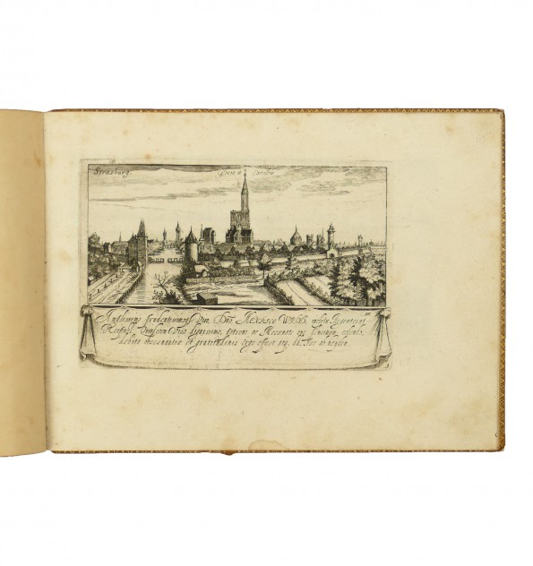 Plein veau glacé, plats ornés d'un encadrement doré, armoiries de Strasbourg au centre du premier plat, dos rond orné de fers et filets dorés, roulettes aux contreplats, filet pointillé doré sur les coupes, tranches dorées. Reliure du XIXe siècle.