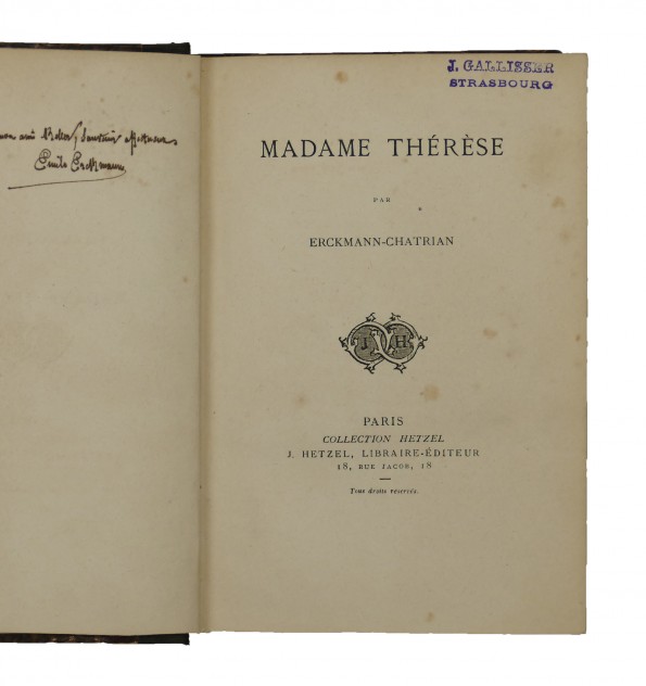 Édition originale de ce titre peu fréquent, comportant un envoi autographe signé de Erckmann en vis-à-vis du titre.