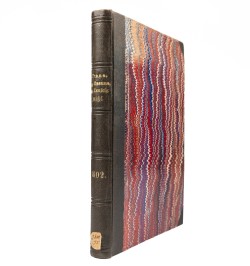 Reliure à la Bradel en demi percaline noir à coins, dos rond titré et rehaussé de faux nerfs à froid, papier petit peigne sur les plats, tranches jaspées. Reliure fin du XIXe siècle.